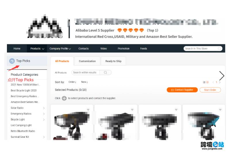 如果同行的店铺在进行旺铺装修的时候,从左侧的装修模块添加了产品的橱窗产品模块,那在店铺的productlist.html下会看到有一个Top picks区域,点开就是橱窗产品的展示列表了。普通出口通店铺有10个橱窗产品,金品诚企方案的店铺则有40个橱窗产品,当然也可以找客户经理购买更多的橱窗订单增加橱窗产品的数量。